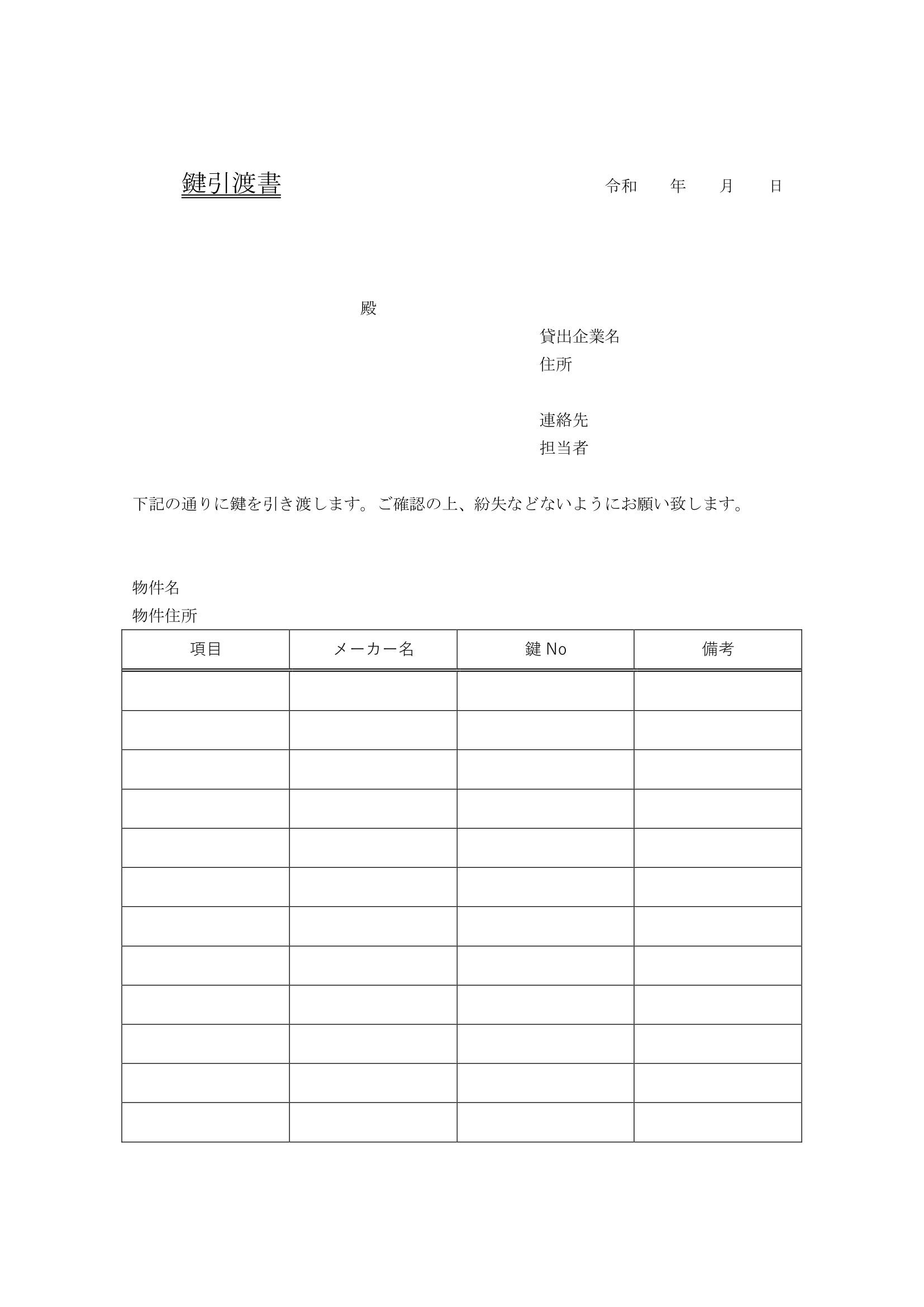 シンプルで使いやすい鍵引渡書のテンプレート