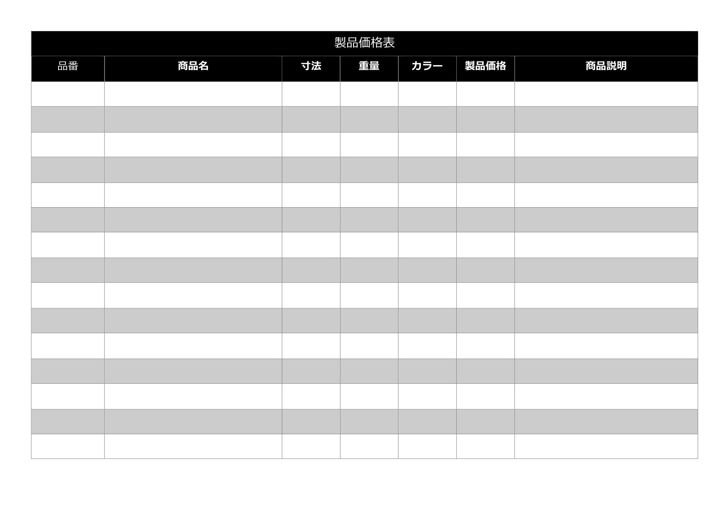 シンプルで使いやすい製品価格表のテンプレート