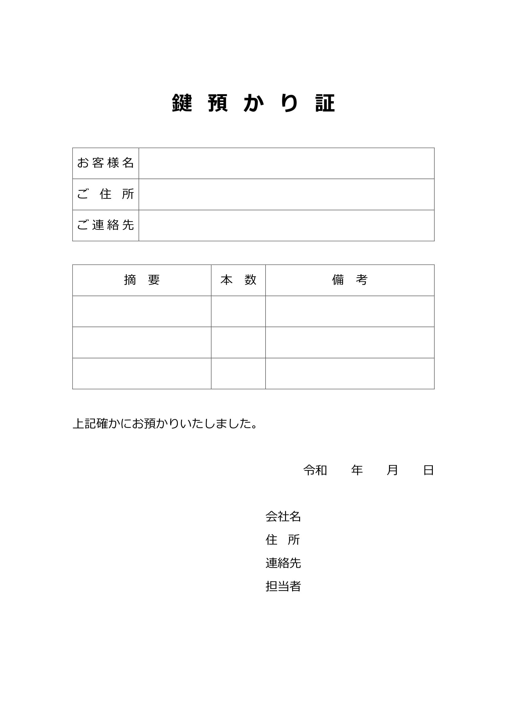 シンプルで使いやすい鍵預かり証のテンプレート